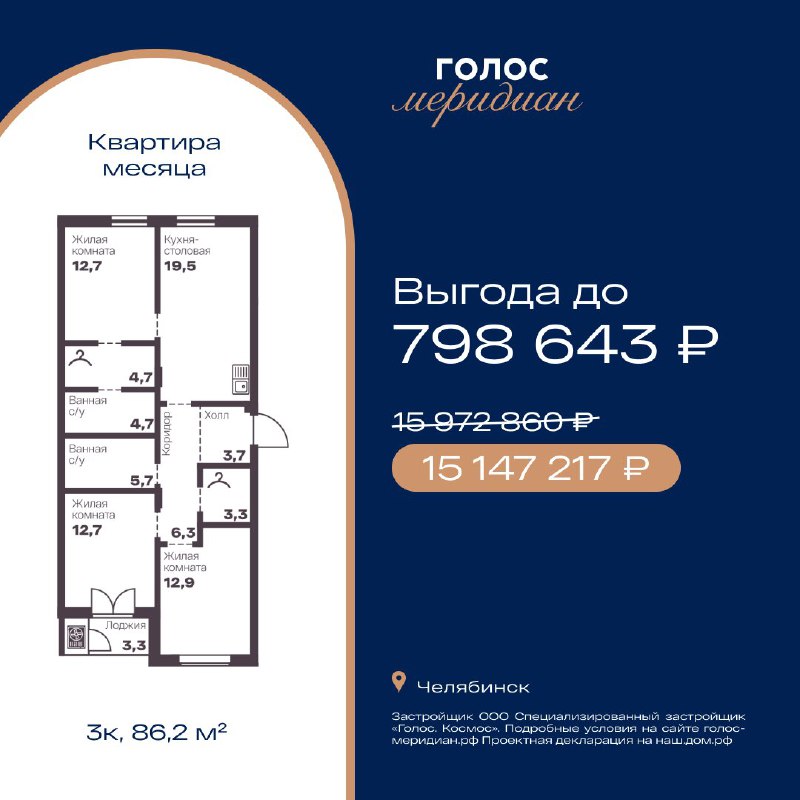 Квартира месяца в Голос Меридиан — выгода до 799 тысяч ₽Новый проект девелопера «Группа Голос» в Челябинске для тех, кто ценит высокое качество жизни. В жилом квартале «Голос Меридиан» есть: