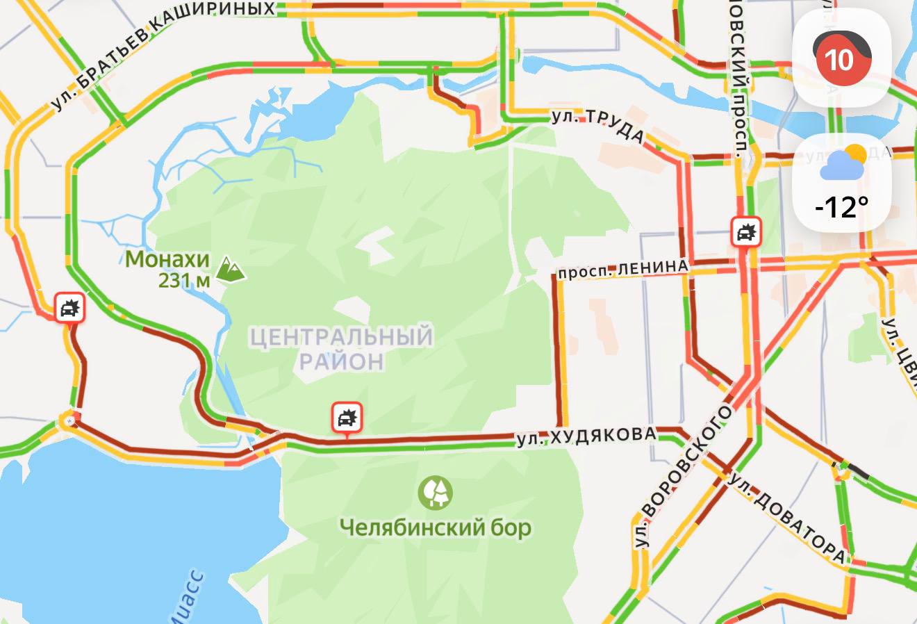 Стоит и вся улица Худякова, причем пробка начинается с Доватора. Яндекс уже оценивает ситуацию в городе на 10 баллов.